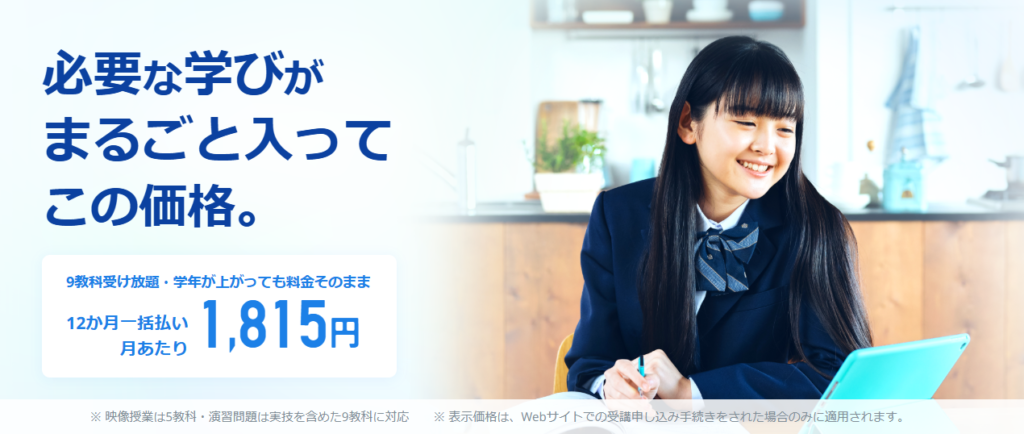 | 学習スタイル | PC、タブレット、スマートフォンのいずれかを利用した 映像授業の視聴 と 演習問題 の実施 |