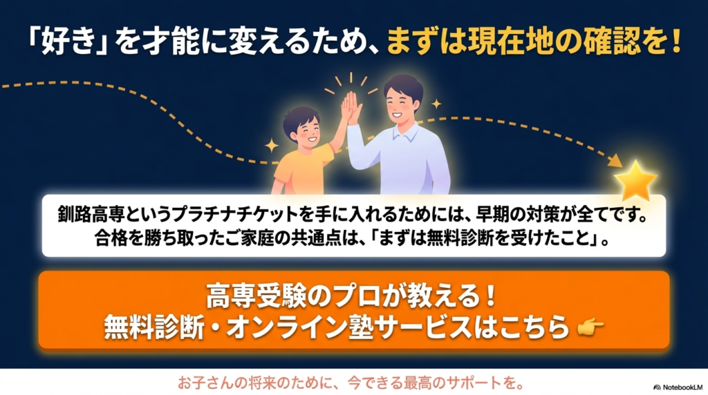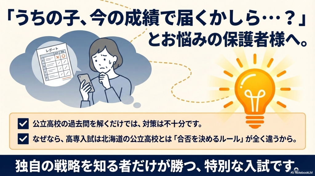 特に釧路高専は、理数系の点数が2倍になる傾斜配点や、中1からの成績が大きく響く内申点計算、さらには全国から受験しやすいオンライン入試の導入など、独自の戦略が必要です。