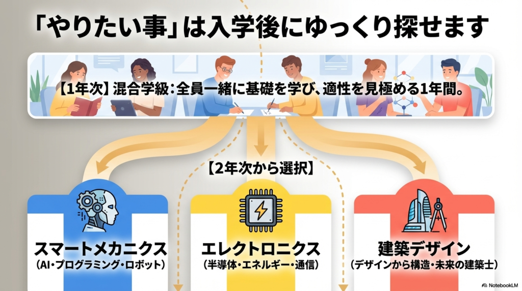 釧路高専の最大の特徴は、1年次は「混合学級」で全員一緒に学び、2年次からそれぞれのコースに分かれるという点です。
