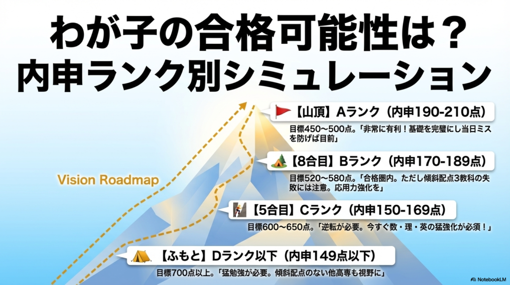| Cランク | 150点〜169点 | 600点〜650点 | 当日での「逆転」が必要。今すぐ数・理・英の強化が必須です。 |
