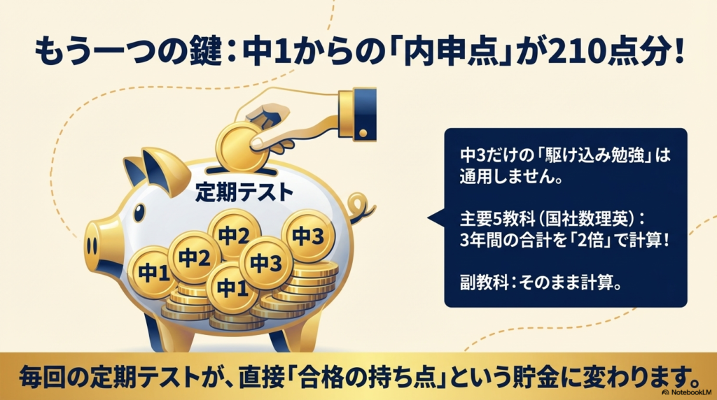 合計で210点満点。 主要5教科の重みが実技の2.5倍以上あり、日々の定期テスト対策が直接「合格の持ち点」になります。
