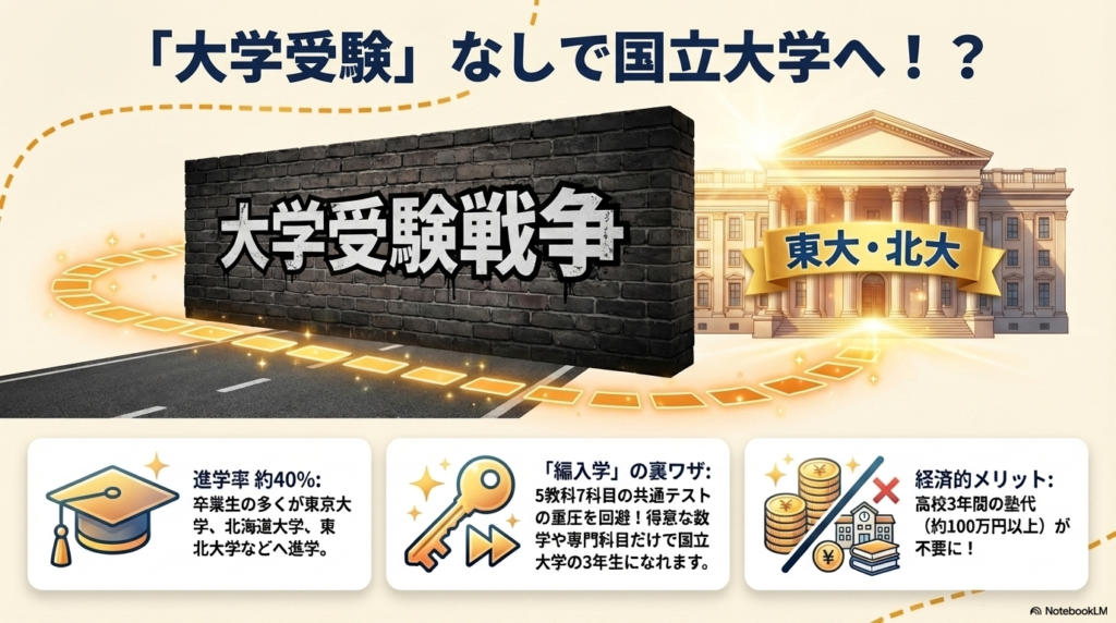 - 親御さんのメリット: 一般的な「5教科7科目の共通テスト」の重圧を回避し、得意な数学や専門科目で国立大学の3年生になれる「編入学」制度。高校3年間の塾代をかけずに、国内トップクラスの大学を目指せます。