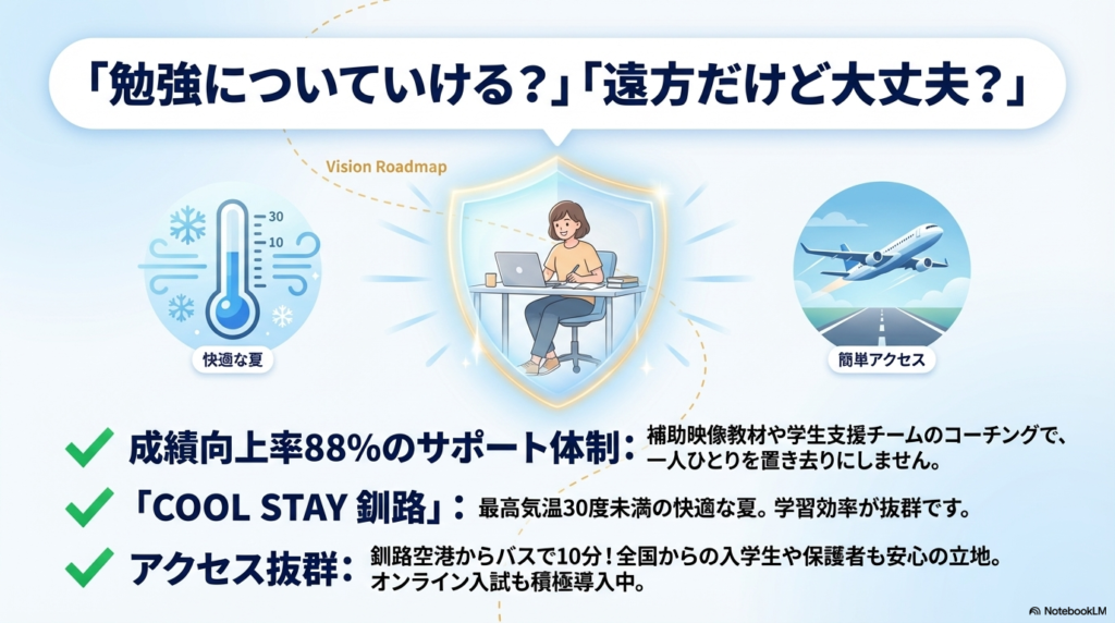 また、「釧路空港からバスで10分」というアクセスの良さは、道外から入学する学生や、送り出す保護者の方にとっても大きな安心材料です。