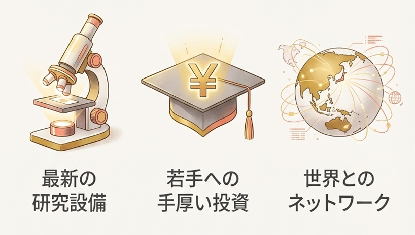 世界と戦える研究環境: 資金不足で遅れていた研究設備の更新や、高度技術者の配置を加速させます。